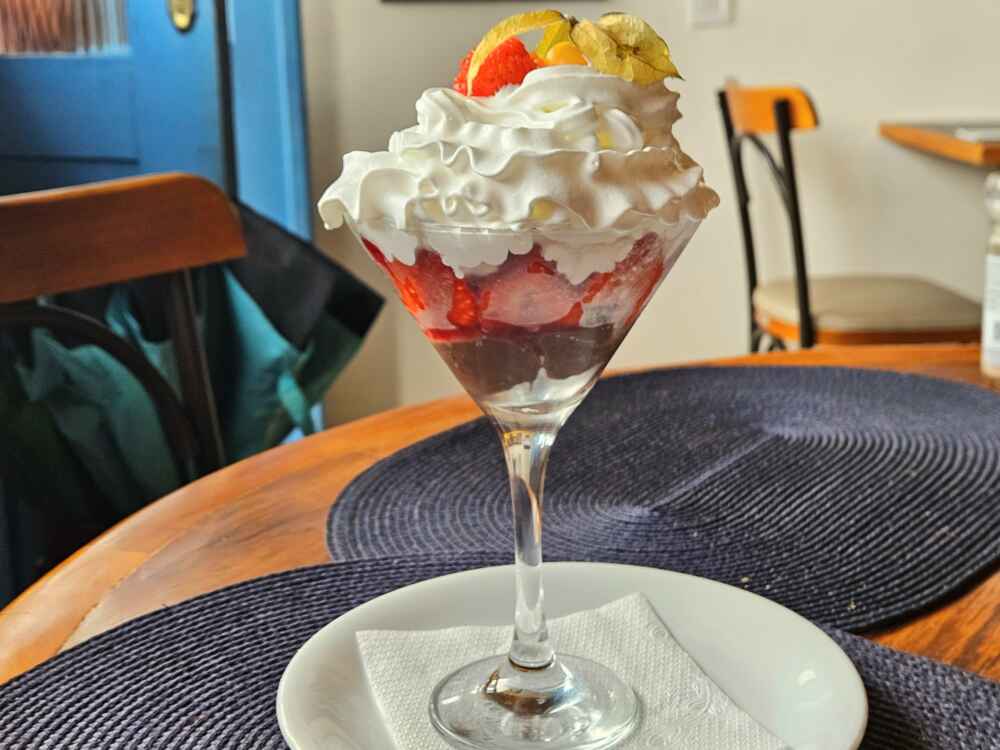 A sobremesa que eu recomendo é a Bariloche. É uma ganache de chocolate com pão de ló, calda de frutas vermelhas e chantilly: