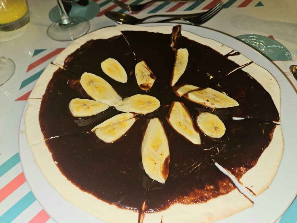 De sobremesa fazem uma pizza doce de banana com chocolate: