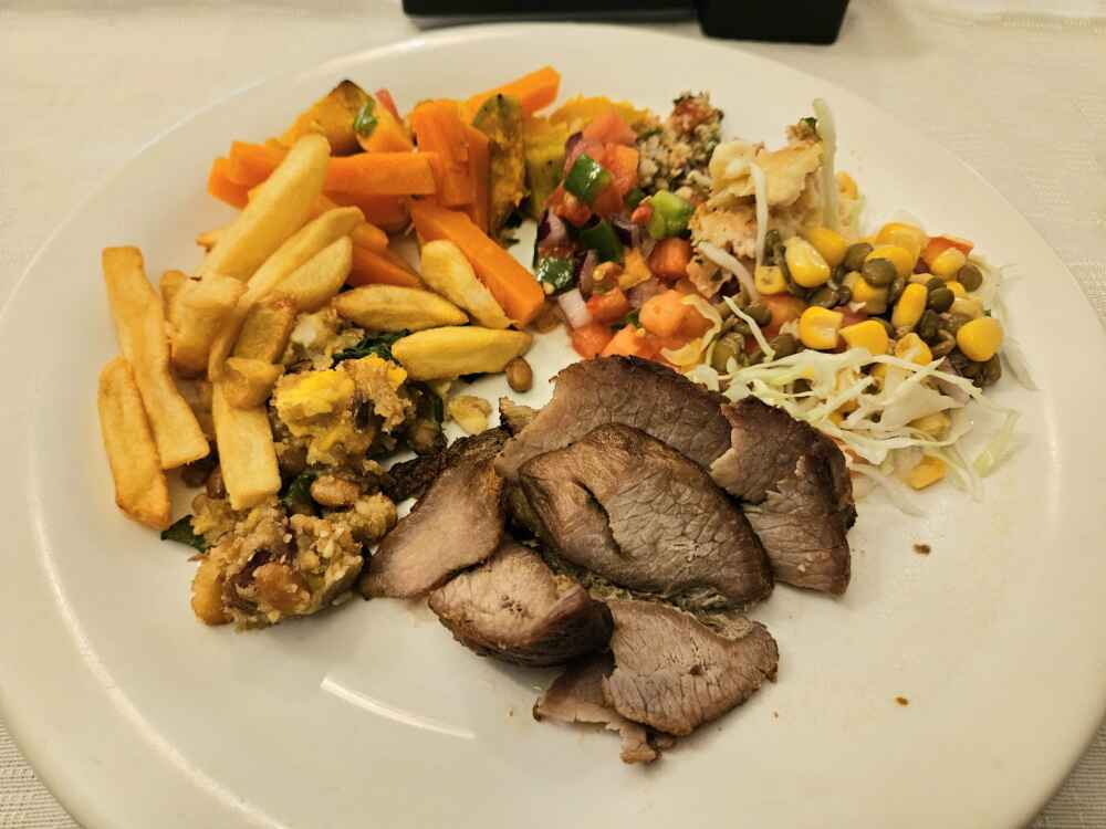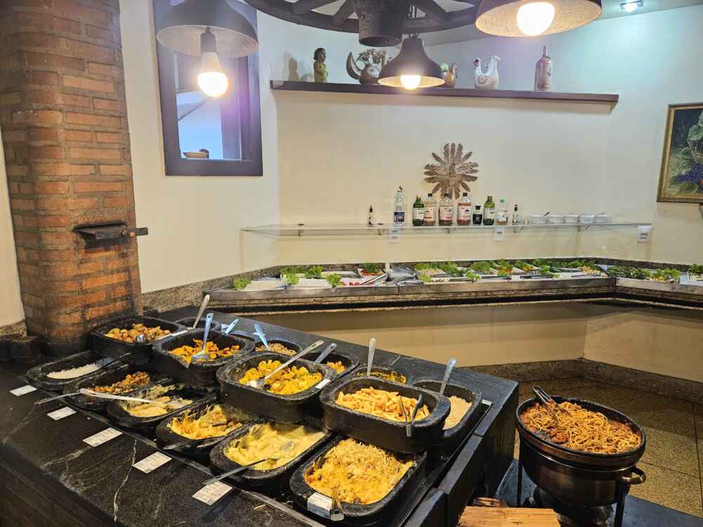 No almoço é buffet por kilo. Além de saladas e diversas opções de pratos quentes, tem também churrasco na brasa, chope local e adega com vinhos locais.