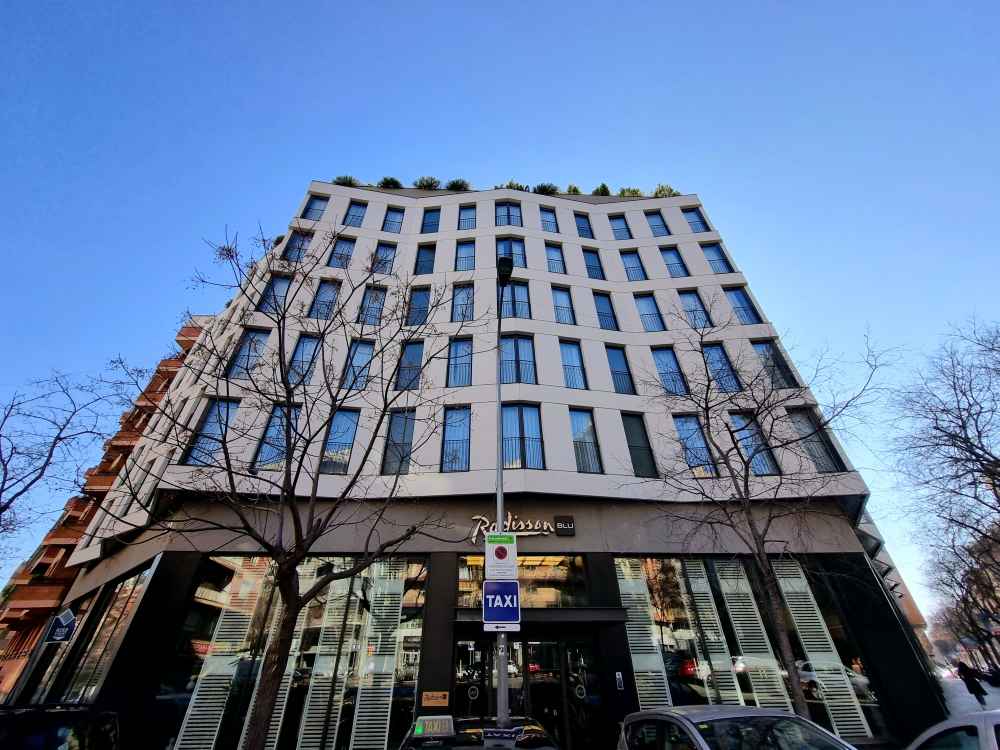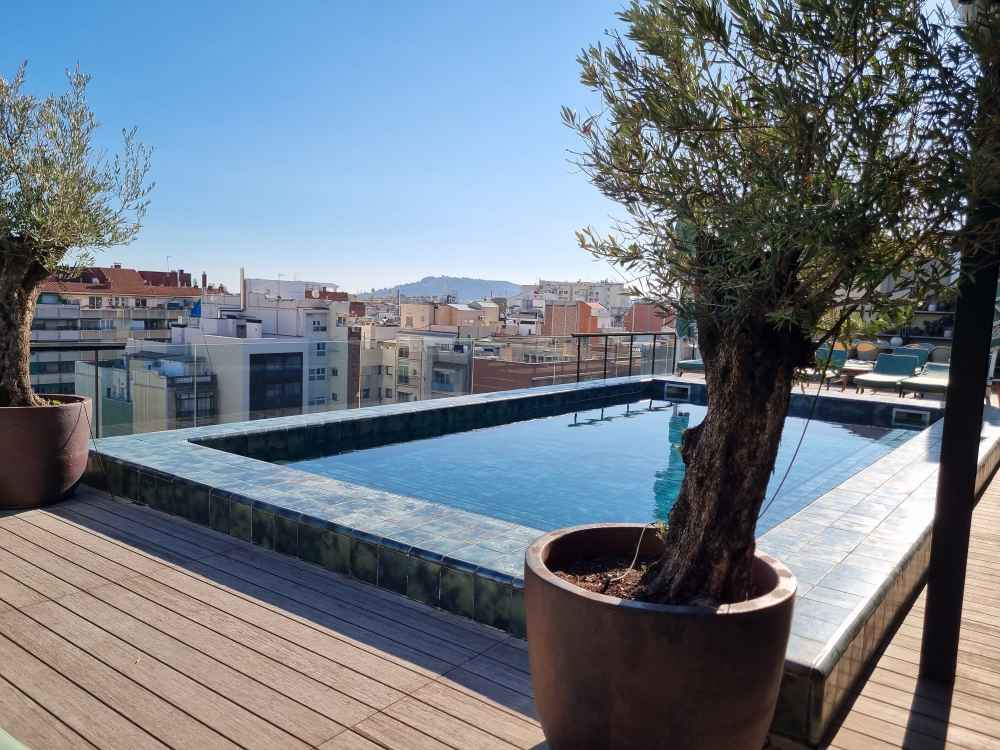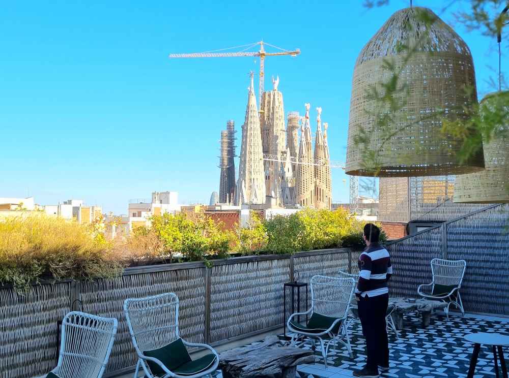 O hotel conta com uma área externa com vista da Sagrada Família e piscina: