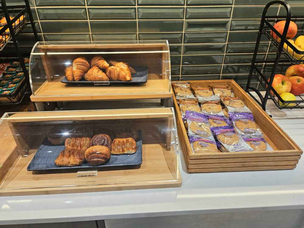 Tem cookies, sorvetes, Doritos, Ovos cozidos, iogurtes, pães e muito mais. Tudo a vontade e 24h por dia! Por volta das 18h sempre tem opções de pratos quentes também!