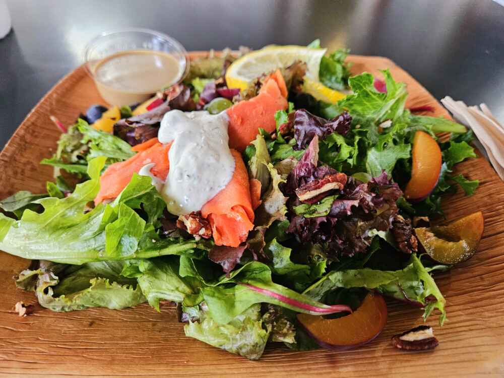 Eu optei por uma salada com salmão de almoço. As outras opções eram lanches como Panini e Focaccia. Após o almoço tem também uma degustação inclusa com 6 tipos de vinhos.