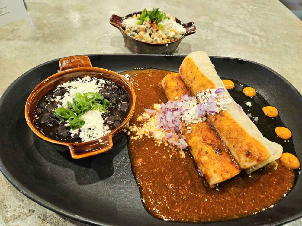 Pedi enchiladas chilangas de frango. É um prato tradicional mexicano que consiste em uma tortilha de milho enrolada em um recheio, coberta com um molho saboroso. Veio acompanhada de feijão.