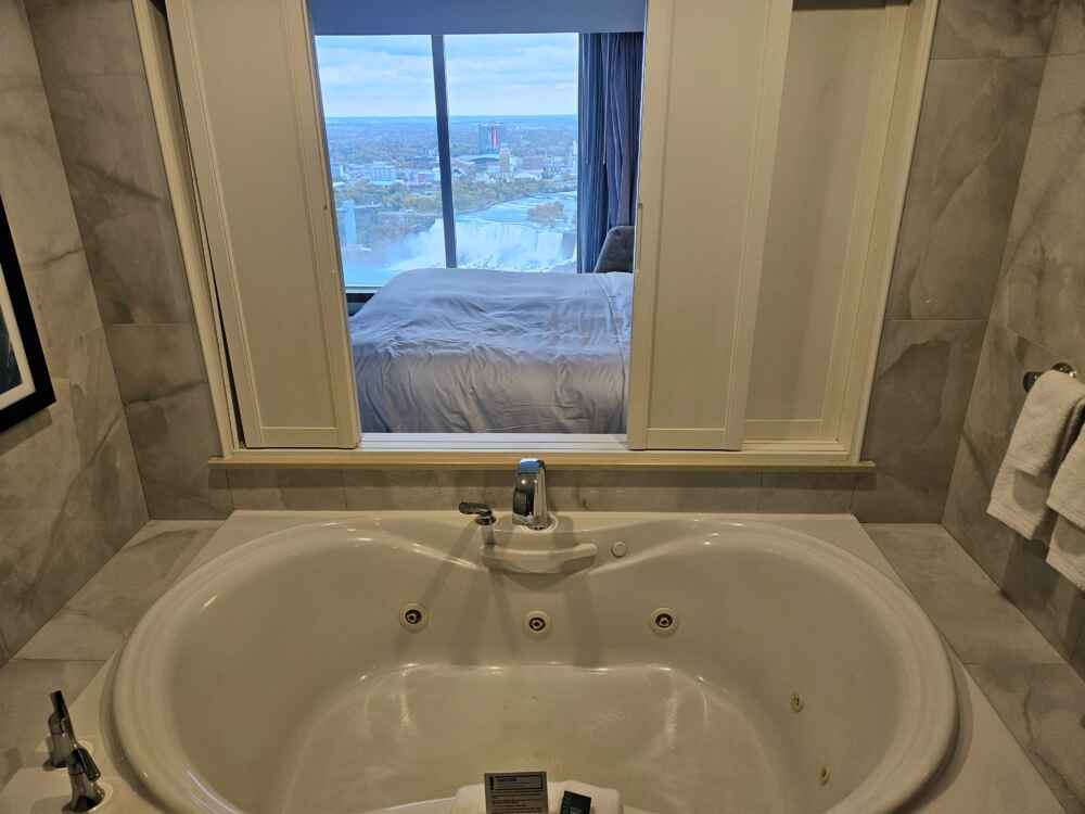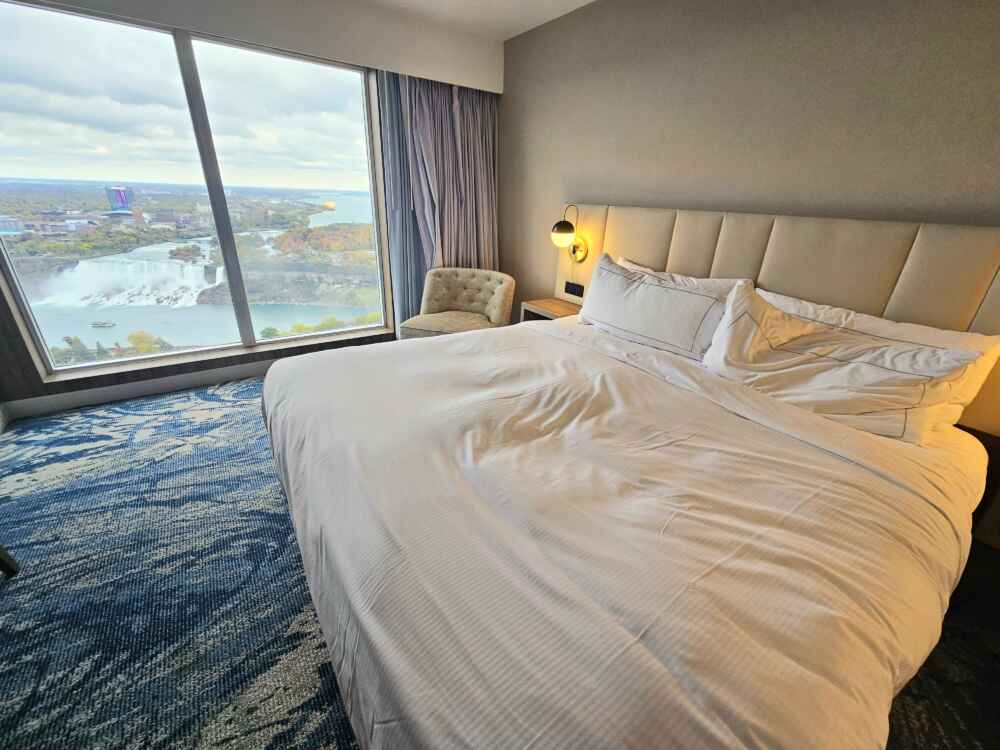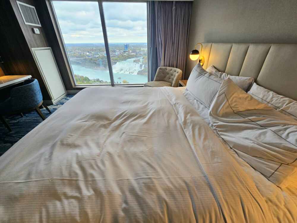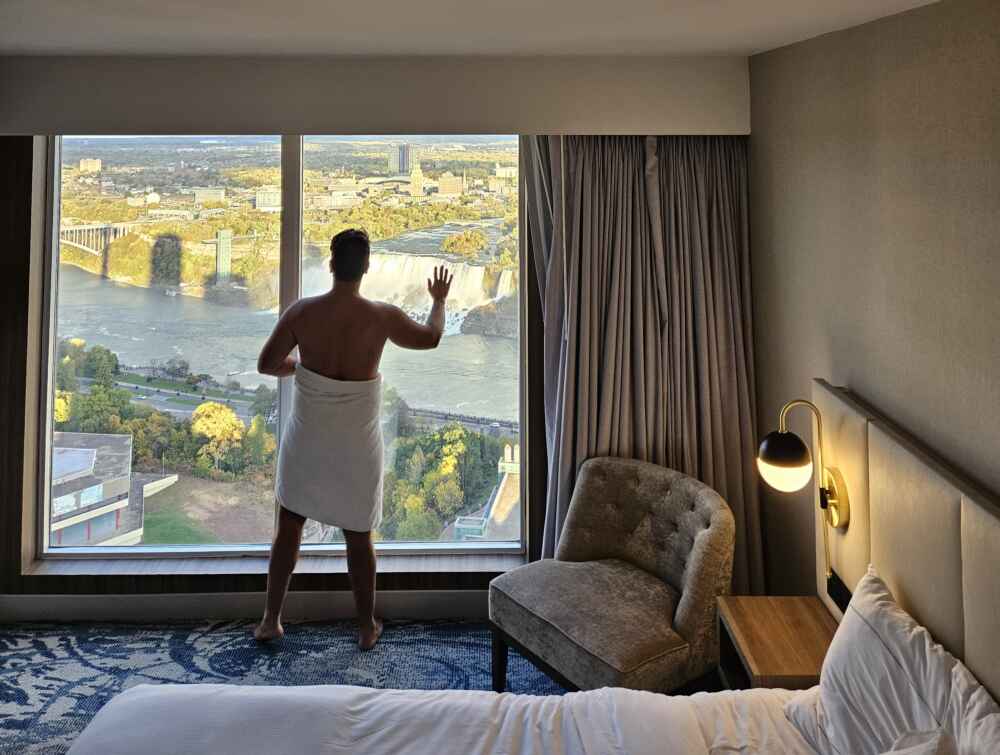 Eu reservei uma Acomodação FallsView em um andar alto e a vontade era nem sair do quarto.