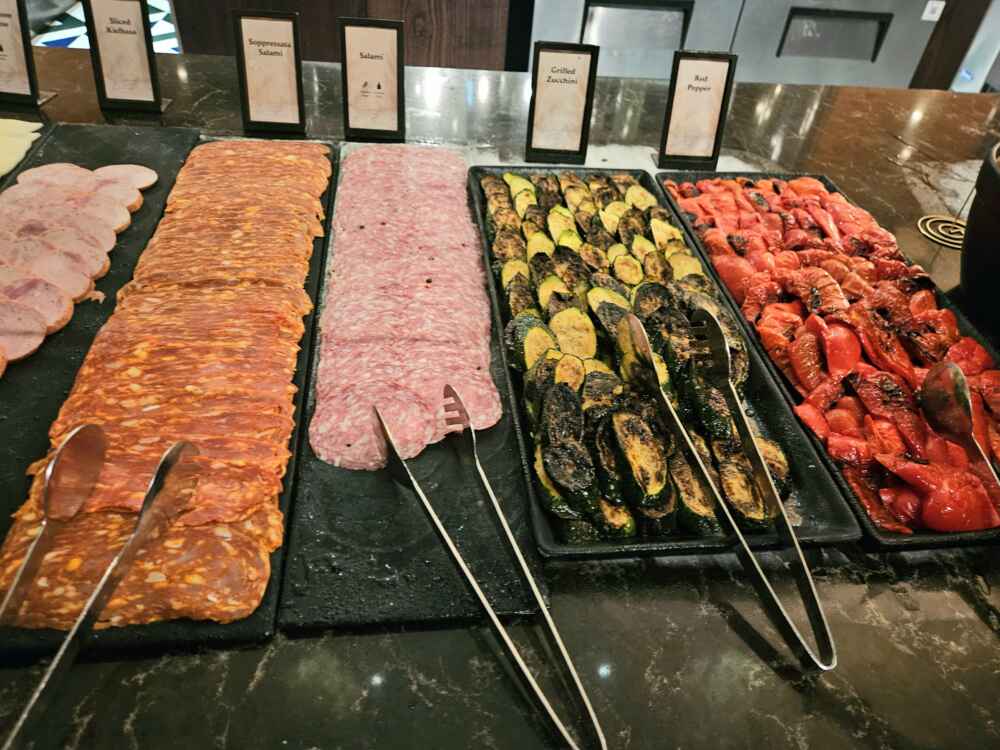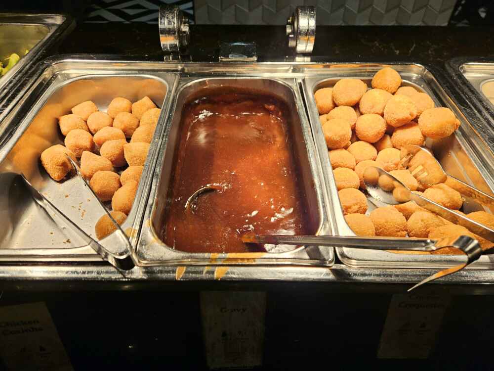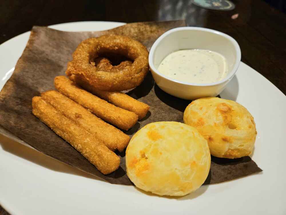 O buffet ten de tudo: saladas, massas, coxinhas, croquetes, frios e muitas outras opções. Servem também na mesa pão de queijo, onion ring e mandioca.