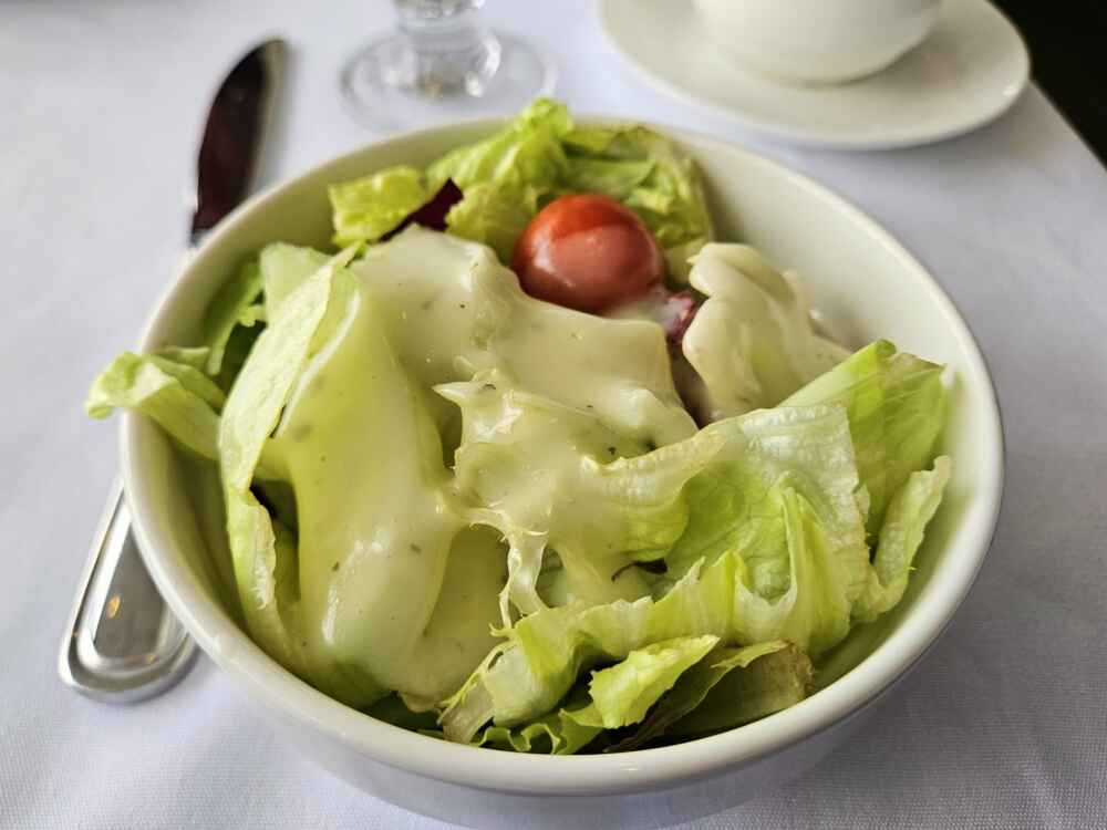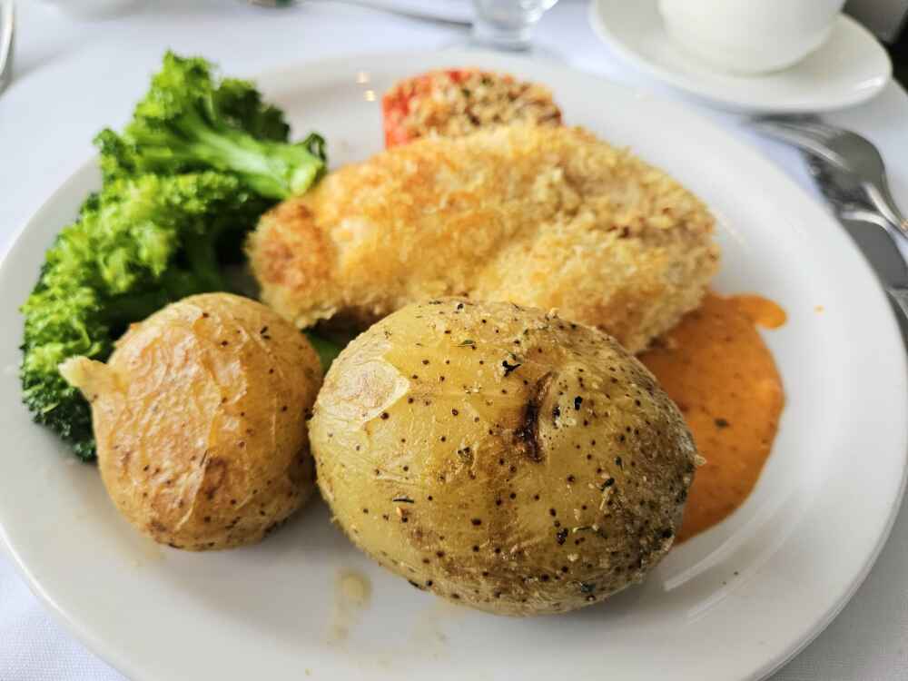 Eu escolhi peixe com legumes. Serviram uma salada antes, e no final uma sobremesa.