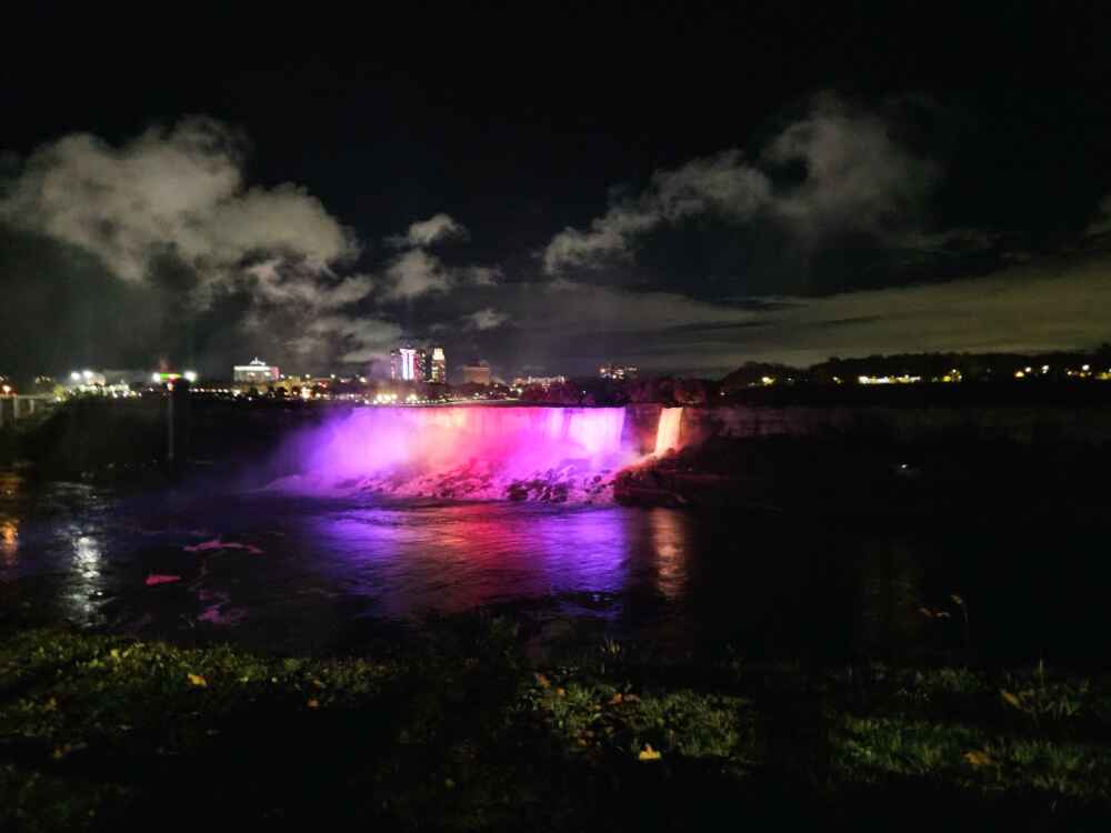 Uma vantagem de se hospedar em Niagara Falls e não só fazer um day tour de Toronto, é poder ver as cataratas iluminadas a noite: