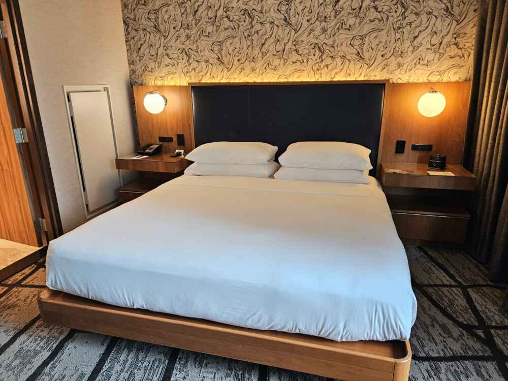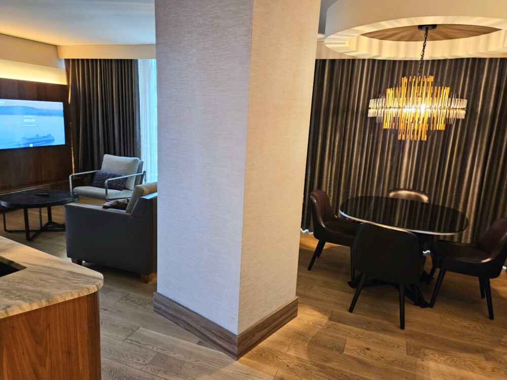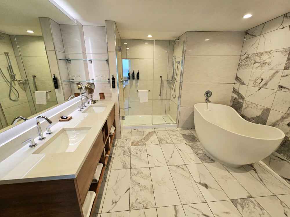 As acomodações podem ser com cama King ou cama Queen, e são divididas em várias categorias. Eu fiquei em uma acomodação com vista para o mar, 1 cama King, Sala de estar com sofá cama, mesa de jantar, frigobar, cofre e banheiro com banheira.