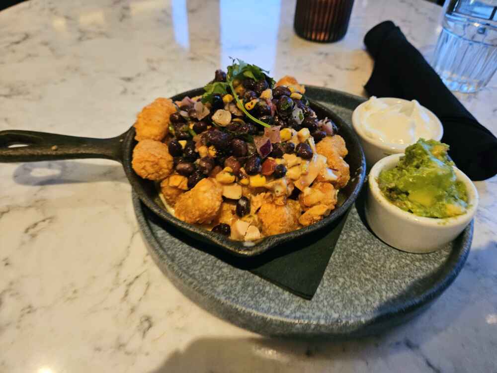 Eu provei o Totchos, que é uma comida com nachos, feijão, frango e abacate: