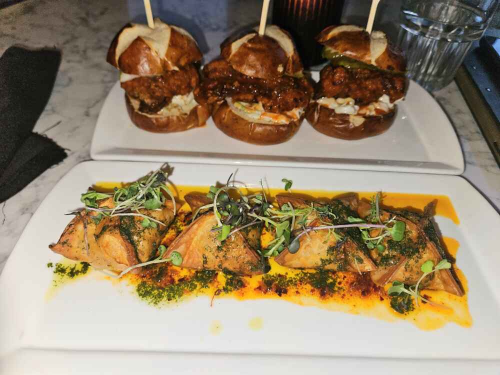 Provei também o Fried Chicken Sliders, que é pretzel com frango + Dim Sun de camarão e caranguejo: