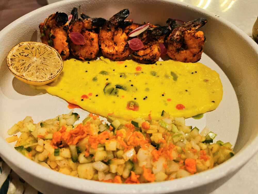 Pedi o Tandoori Prawns, que é um prato com camarões muito bom e vem com um molho bem saboroso.