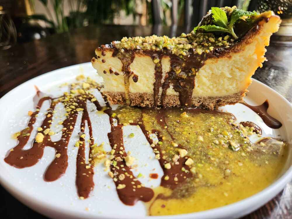 Uma sobremesa imperdível é o chessecake de chocolate com pistache:
