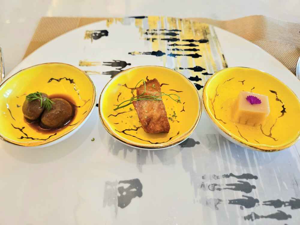 Eu optei pelo menu do chef com várias etapas. Começou com essas entradas: Peixe + Cogumelo + Broto de Bambu: