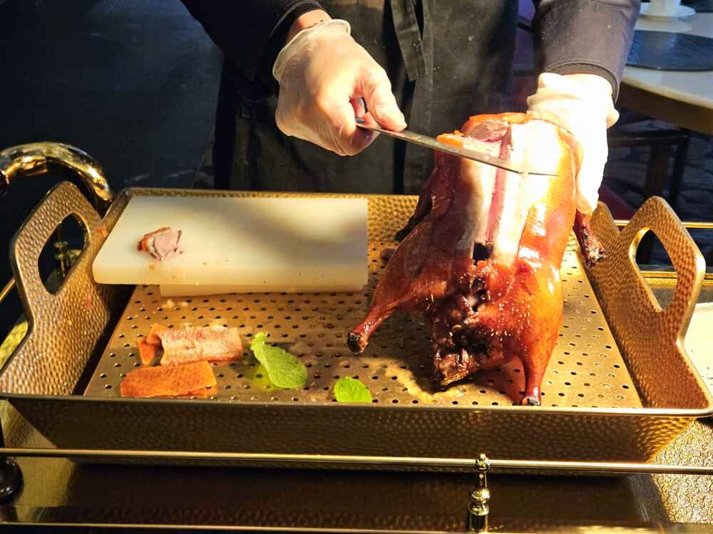 O Pato Laqueado de Pequim é o carro chefe da casa. Eles cortam o pato na hora e na nossa frente.