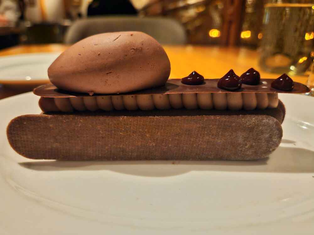 A sobremesa que eu sugiro para finalizar a experiência é a Halzenut Crunch, que é uma torta mousse de chocolate.