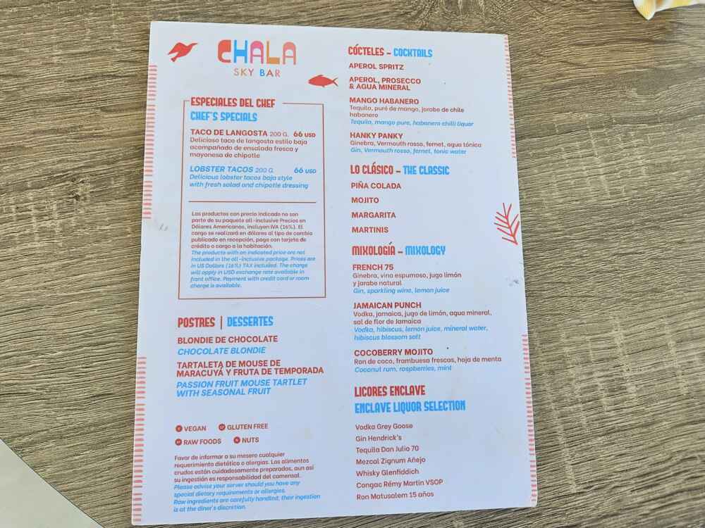 No Chala Sky Bar, que é exclusivo dos hóspedes Enclave, também podemos pedir almoço à la carte. Tudo é excelente!