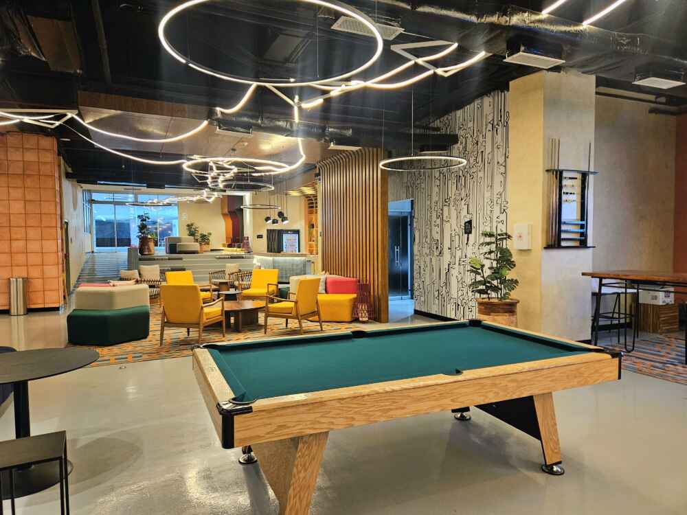 No lounge do hotel é possível pedir bebidas no bar também. Além disso tem uma mesa de sinuca e espaço com sofás.