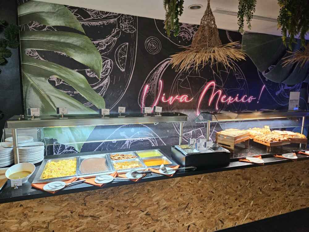 No almoço também preparam comida mexicana na hora. Tem até pizza! Já no jantar, o restaurante vira rodízio com carnes passando na mesa e buffet a vontade.