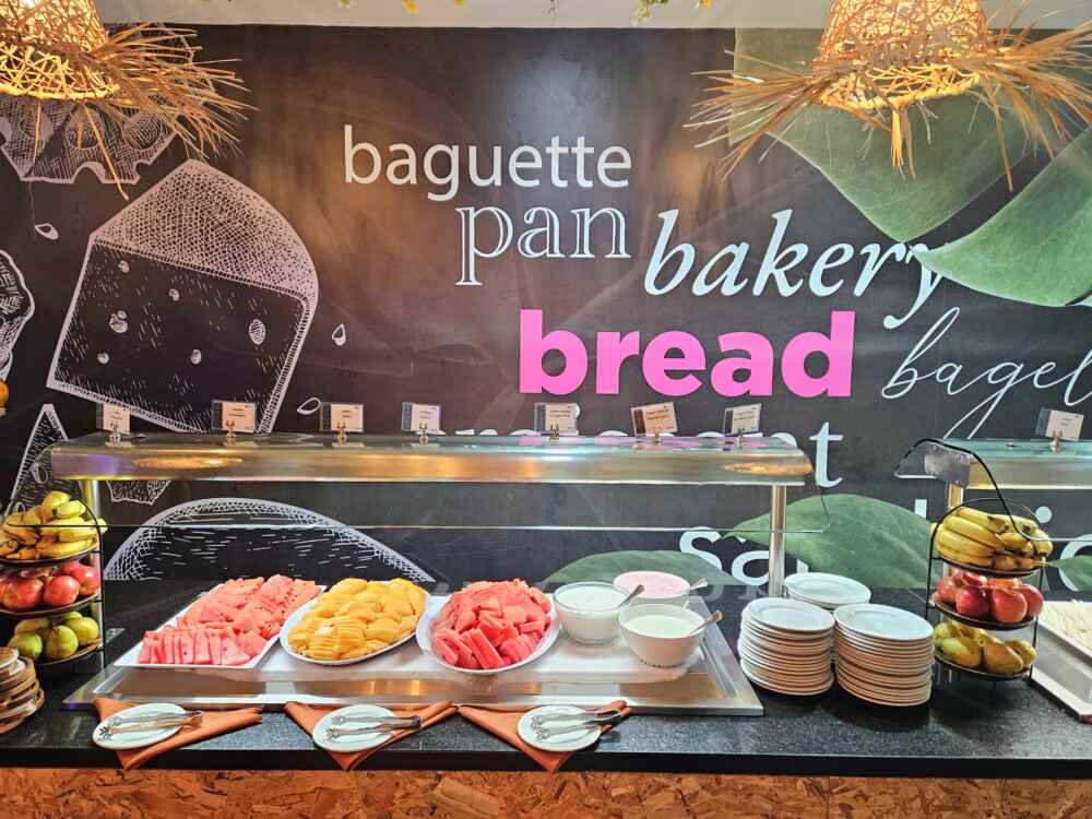 O café da manhã é estilo buffet e oferece uma variedade de frutas, pães, ovos e pratos típicos como frijoles e nachos.
