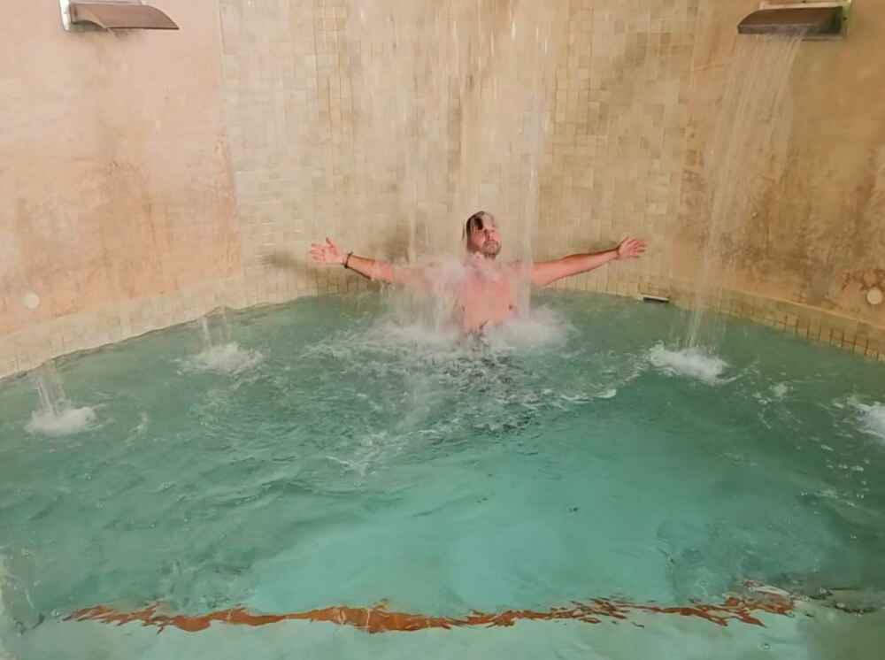 Após a massagem ainda temos direito a hidroterapia na área externa. Tem jacuzzis, sauna e cascatas para aproveitarmos.