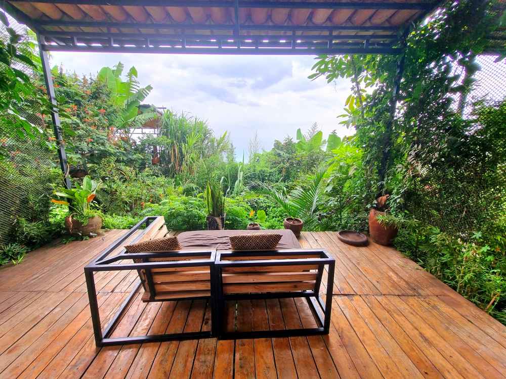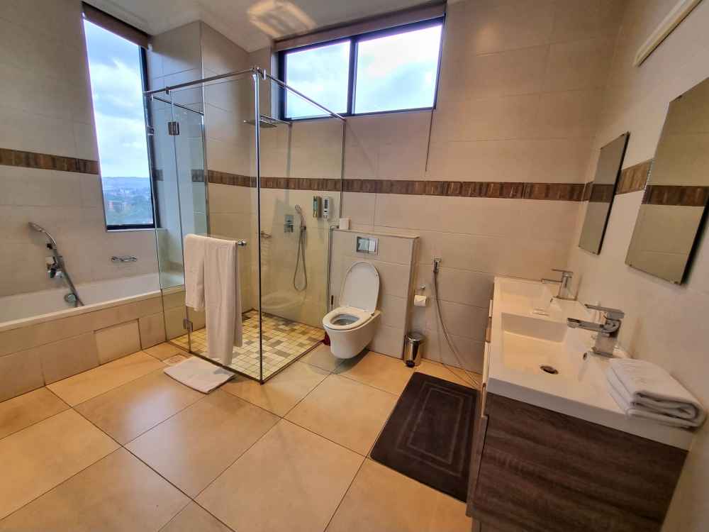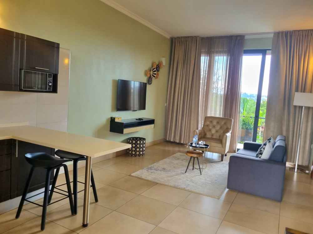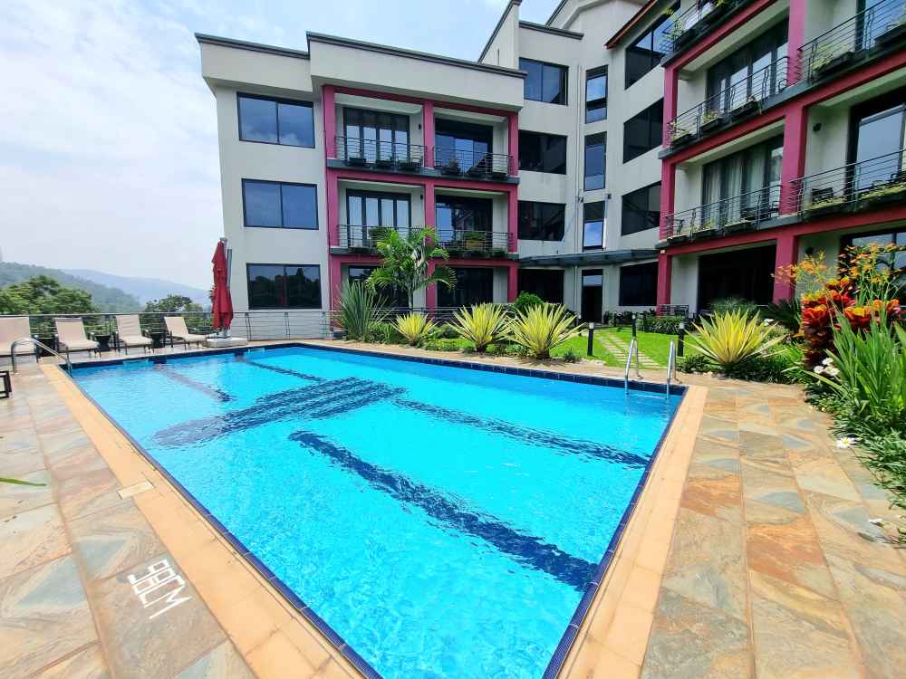 A acomodação conta também com varanda, vista da piscina e do vale de kimihurura: