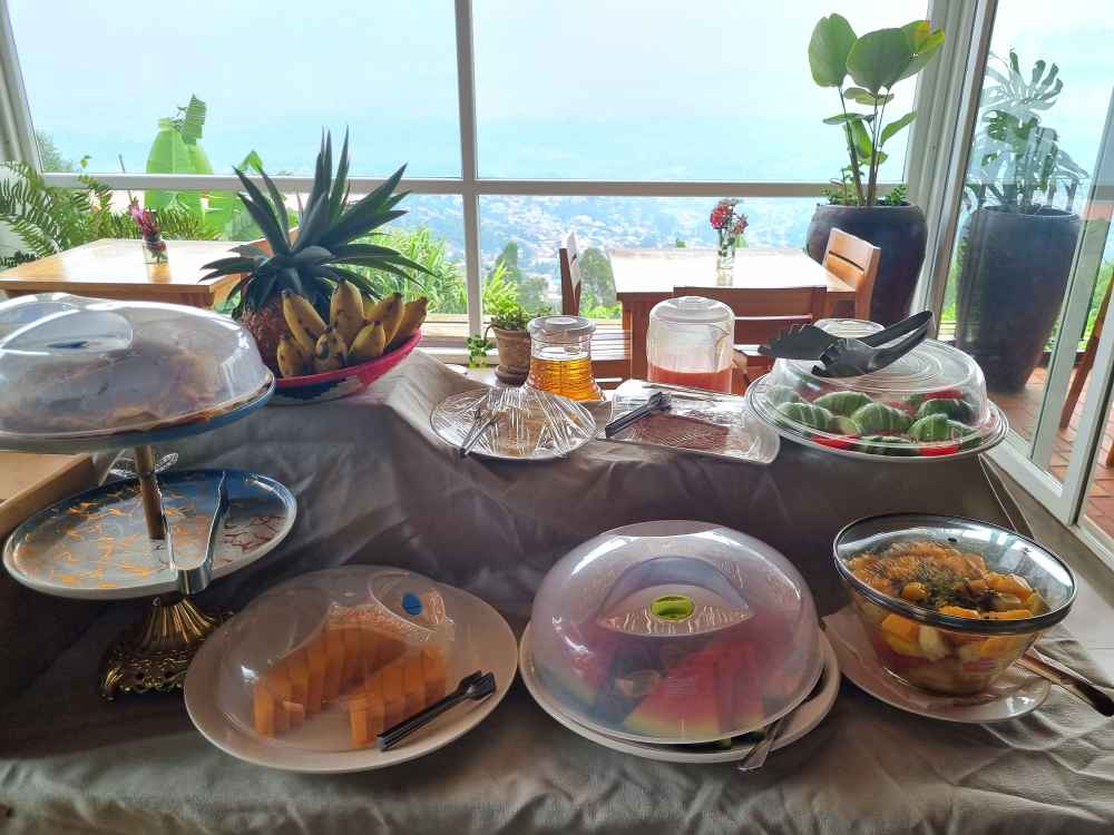 O café da manhã conta com frutas, bolos, panquecas, frios, pratos quentes e mais: