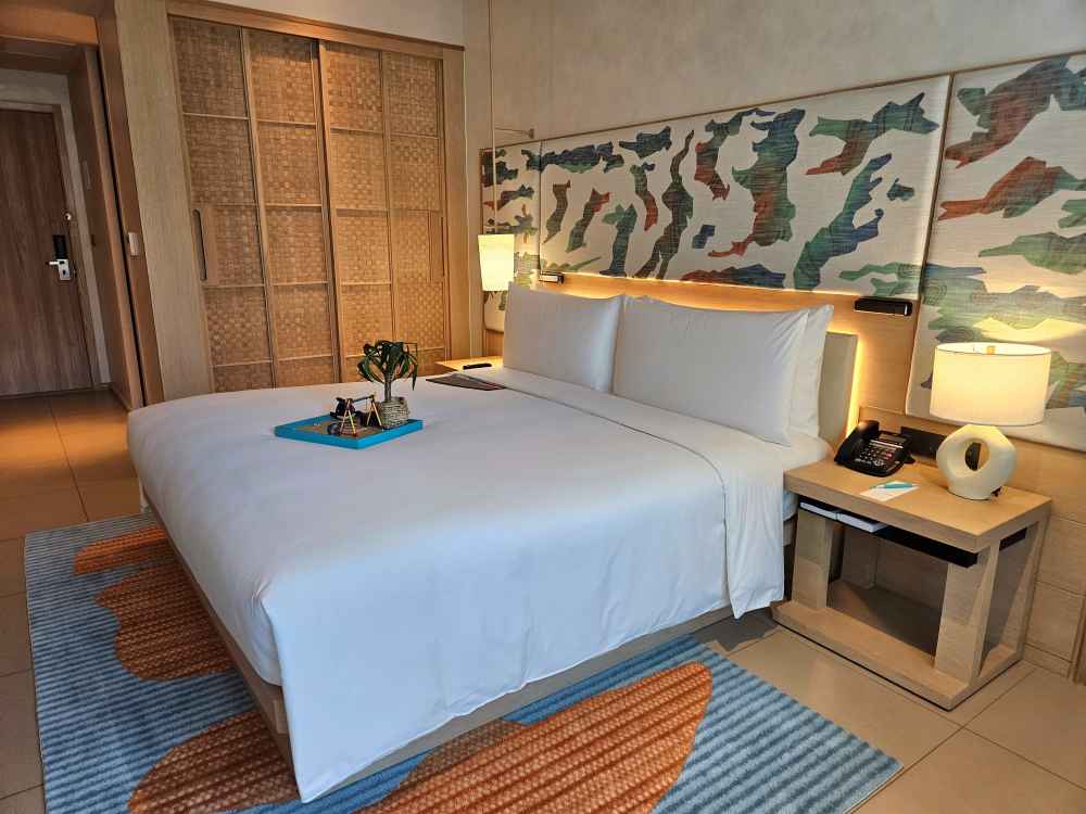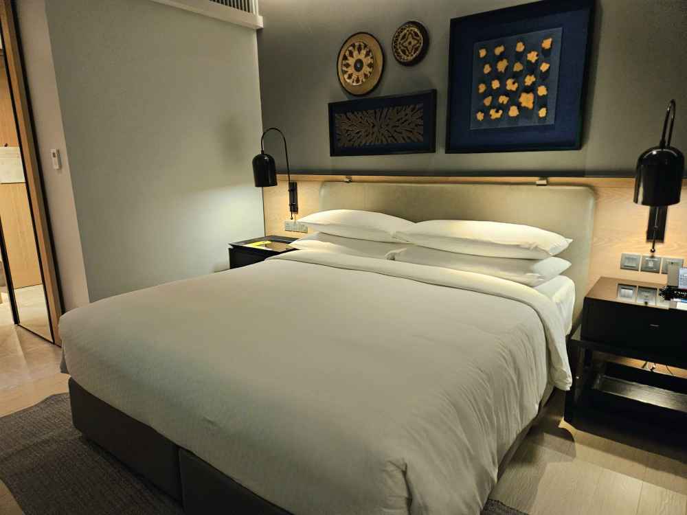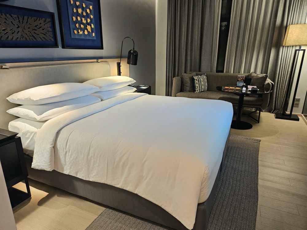 Eu me hospedei em um quarto com cama king, sofá, frigobar, cofre e outras comodidades.