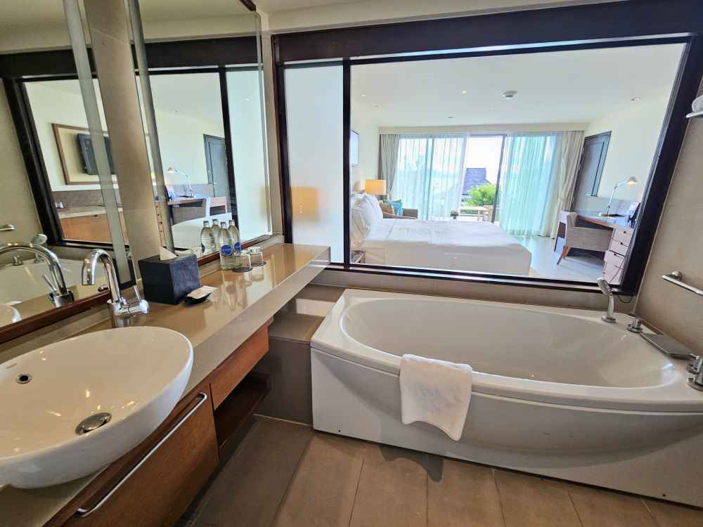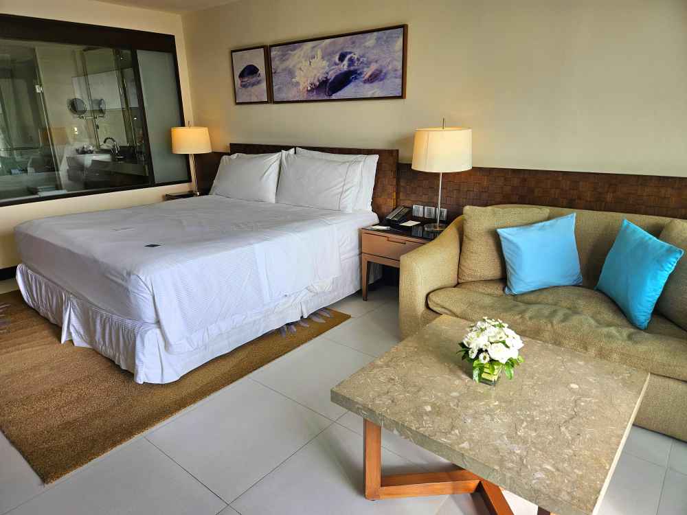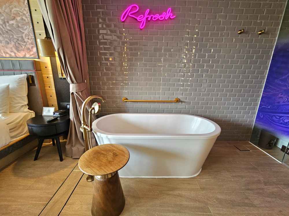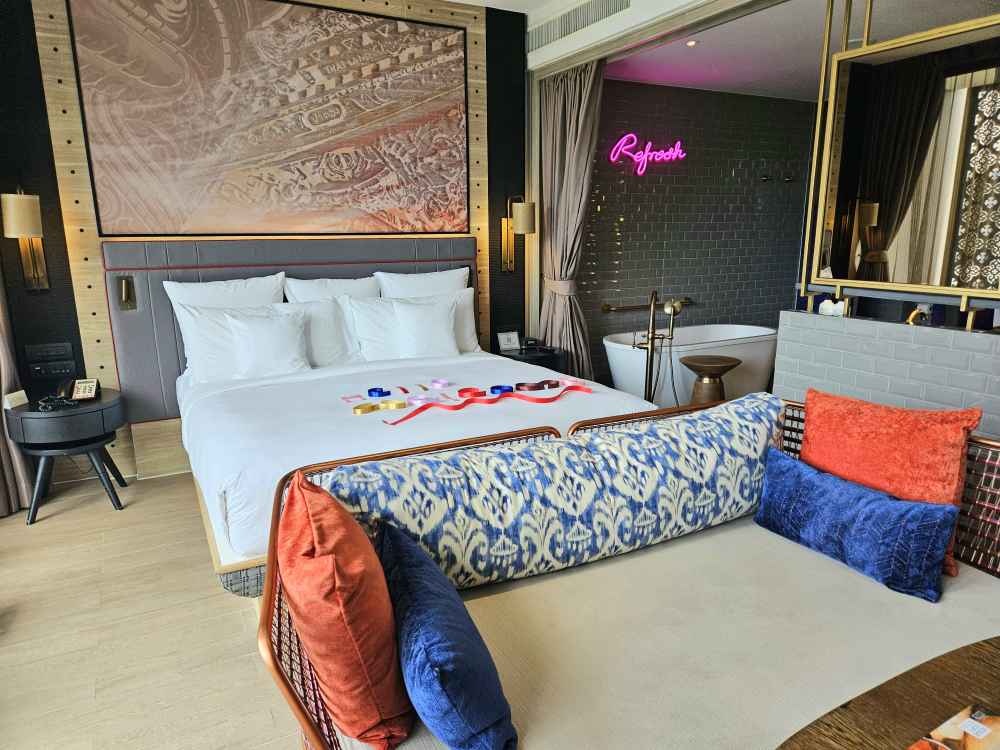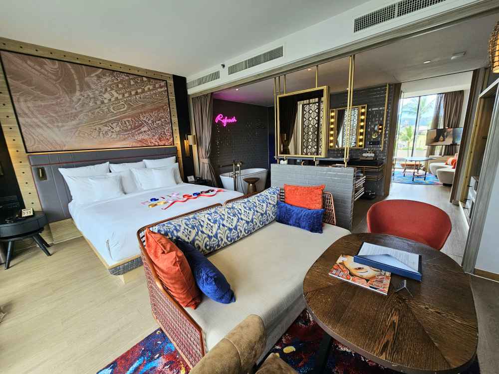 O hotel Indigo Phuket Patong conta com suites bem espaçosas. Eu fiquei em um quarto com banheira, sofá, Tv, minibar, varanda e sala: