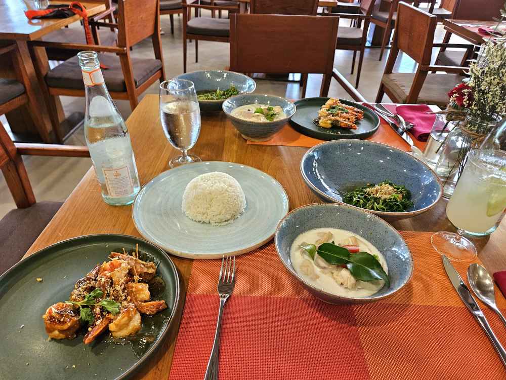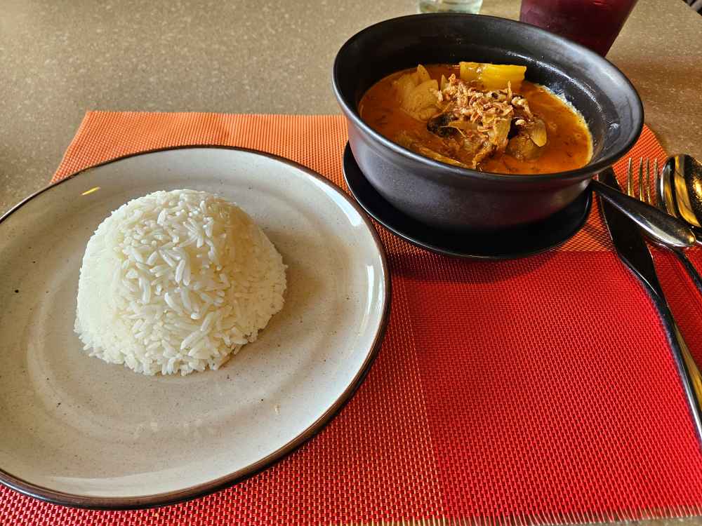 No EEST também tem almoço à la carte. Eu pedi a Pomelo salad, que é um salada típica muito boa. De prato principal provei o Curry, que também é um prato bem comum na Tailândia.