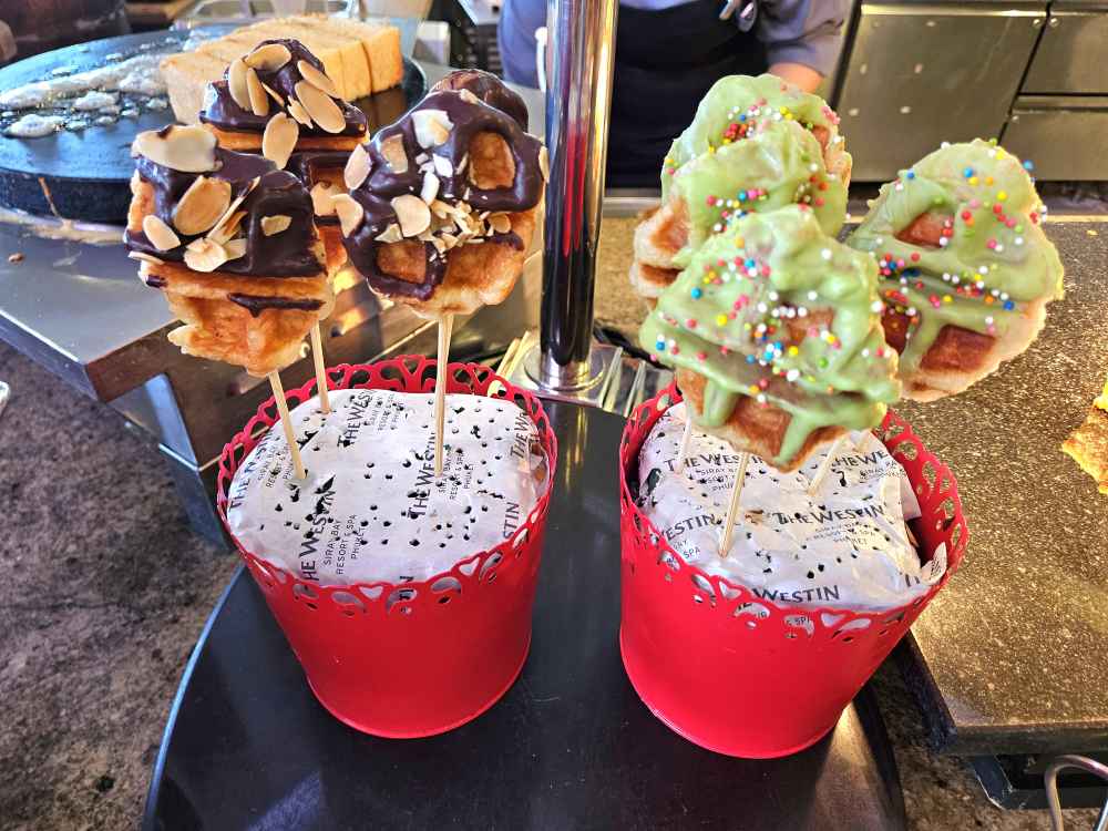 Tem estação indiana, estação chinesa, ovos feitos na hora, vários tipos de pães, doces e etc.