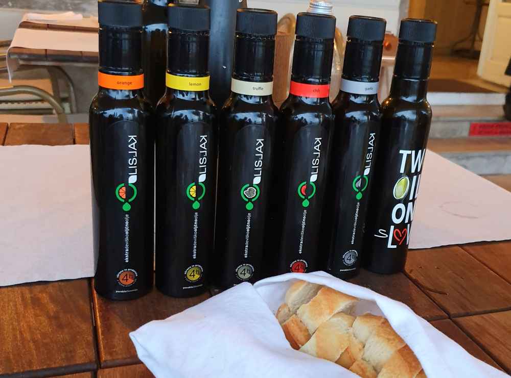De entrada, trouxeram vários tipos de azeite para experimentar com pão: