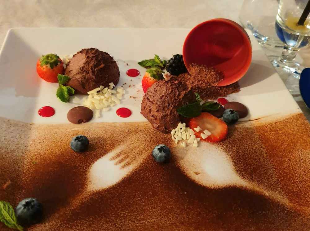 A sobremesa foi uma arte simulando um vaso caindo. É um Mousse de chocolate, sendo que até o vaso era comestível: