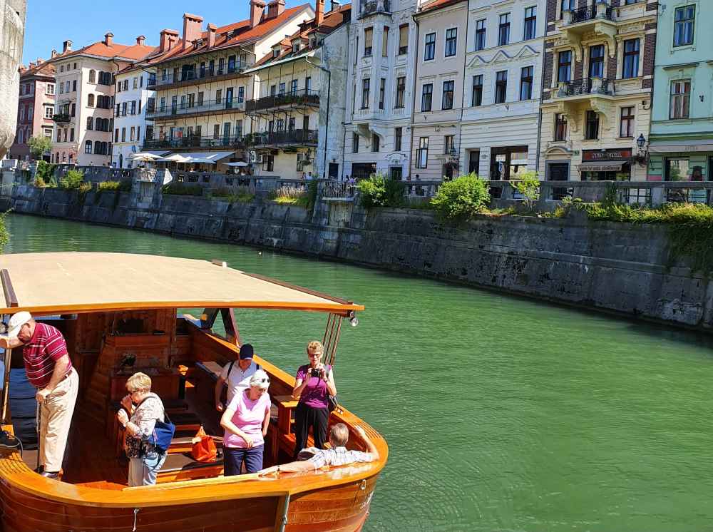 Fiz o passeio de barco pelo rio que corta Ljubljana. Esse passeio é incluso no Visitor Card.